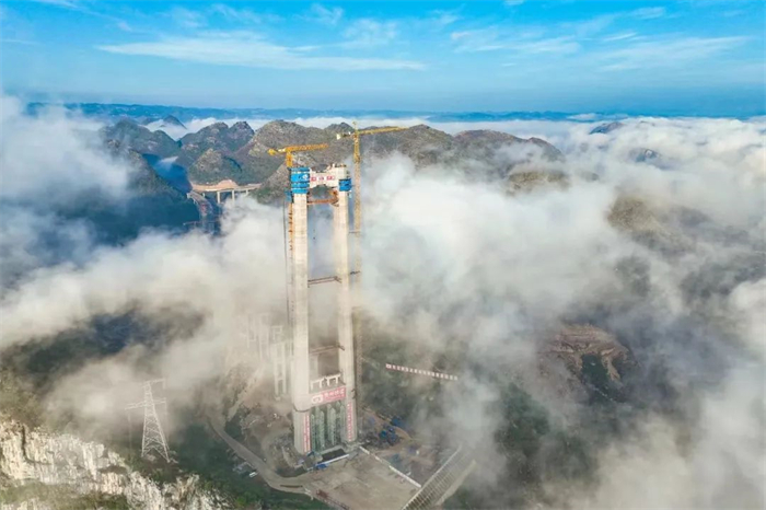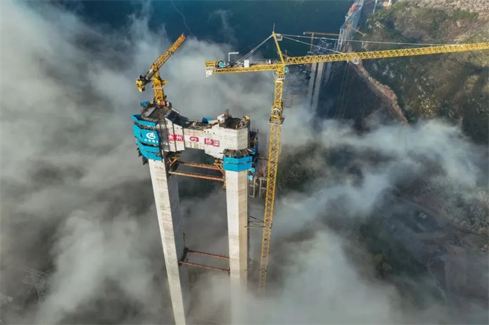 正在修建中的花江峡谷大桥5号主塔(8月3日摄)。新华社记者 陶亮 摄