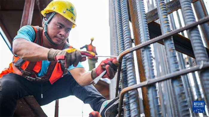 贵州公路集团工人在花江峡谷大桥5号主塔进行施工(8月3日摄)。新华社记者 陶亮 摄