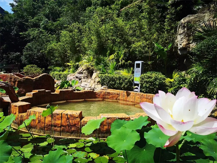 温泉区为临江退台式结构,共有3个平台,平台之间以环形道路联通,每个平台每个泡池均能欣赏秀丽峡谷风光。共有形态、大小、水温各异的特色室外泡池40余个。
