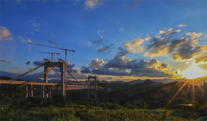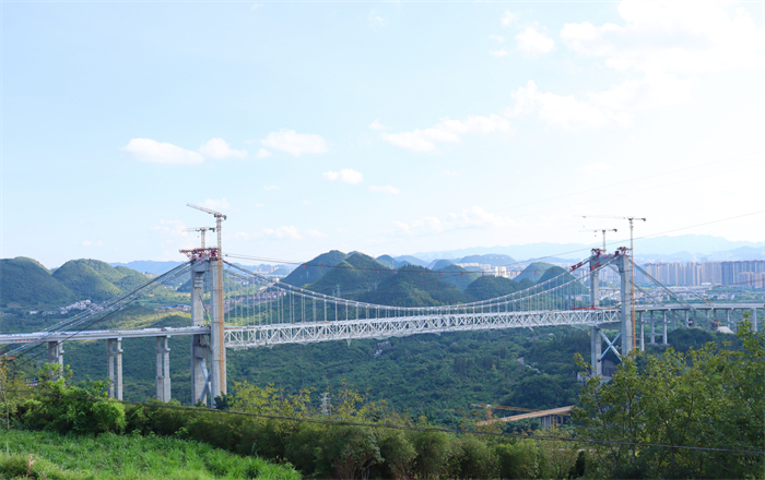 作为贵州省跨径最大的市政悬索桥,金州大桥全长1600米,主跨450米,主桥共设有44个钢桁梁节段。今年3月31日,大桥开始首节段钢桁梁吊装,当前吊装进度已达98%,整体形象进度约96%,项目部正在着手推进主桥钢纵梁吊装、桥面板安装、引桥湿接缝焊接以及桥梁附属工程施工等。
