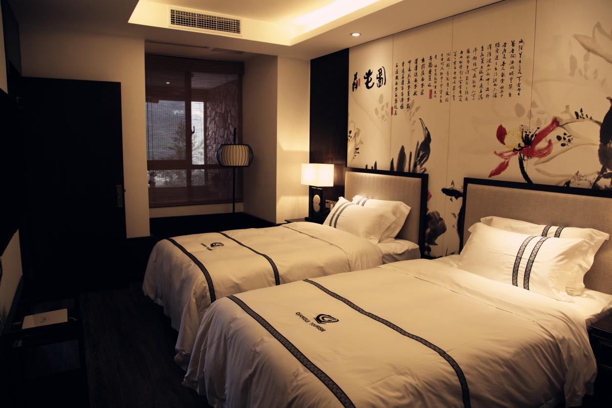 套餐包含:双床房2间、大床房2间,温泉门票8人份,自助早餐8人份,室内泡池4个,室外泡池2个,餐厅、会客厅各1个。
