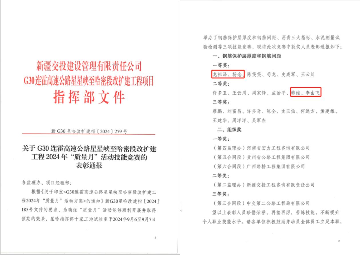 近日,新疆交投建设管理有限责任公司、G30星哈项目指挥部发布了《2024年“质量月”活动技能竞赛的表彰通报》,由贵州公路集团第三工程有限公司承建的星哈5标职工获星哈项目2024年“质量月”技能竞赛活动一、二等奖。