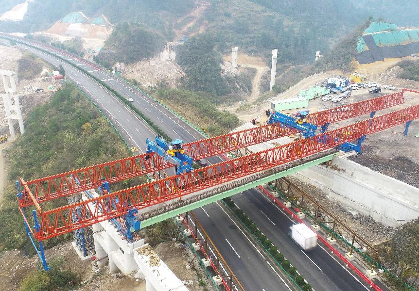 本次吊装的钢箱梁属于大桥第14联,施工横跨现有的贵都高速,拼装后的箱体长度为49.84米,重168.6吨。吊装作业采用两台龙门吊进行拼装,拼装完成后运至桥位,利用自平衡型架桥机进行吊装作业,该架桥机具备自动调节重心保持平衡、高度自动化和功能完善等特性。为确保吊装作业安全顺利,项目团队加强与高速交警、路政等“一路多方”单位的协调联络,采取临时交通管制、规范设置施工标识和安全防护设施等措施,合力保障施工安全和施工作业的顺利实施。