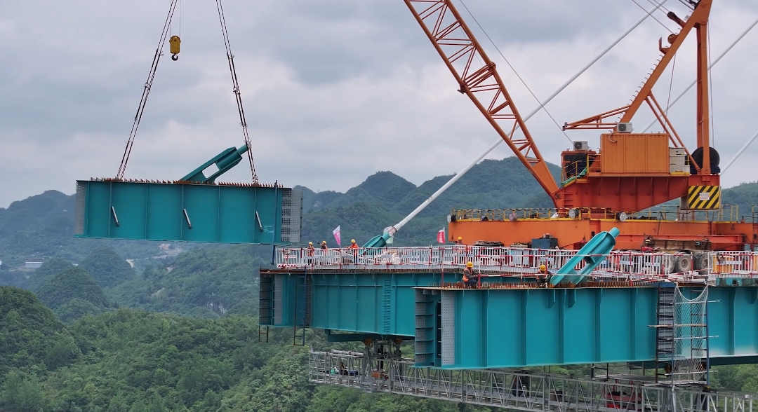 百花湖大桥全长1086米,主桥为(220+320)米的混合梁单塔斜拉桥,主跨采用双边箱钢混组合梁。钢主梁共27个节段,总长320米,总用钢量约5807吨。本次吊装的GZL14节段长12米、重57吨。