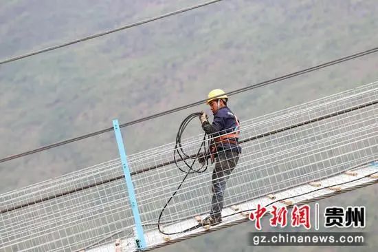 一位工人在大桥猫道上整理线缆。瞿宏伦 摄