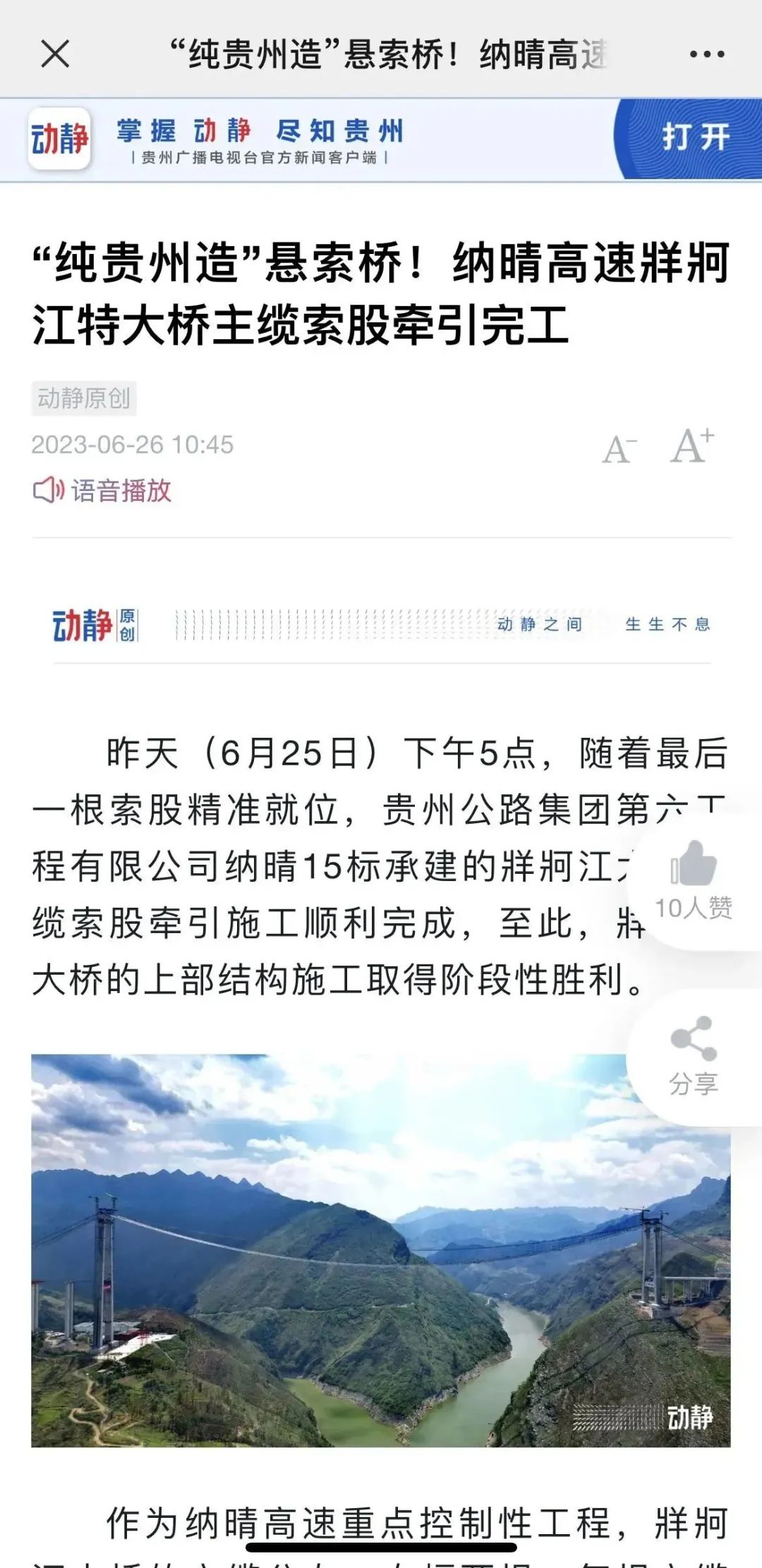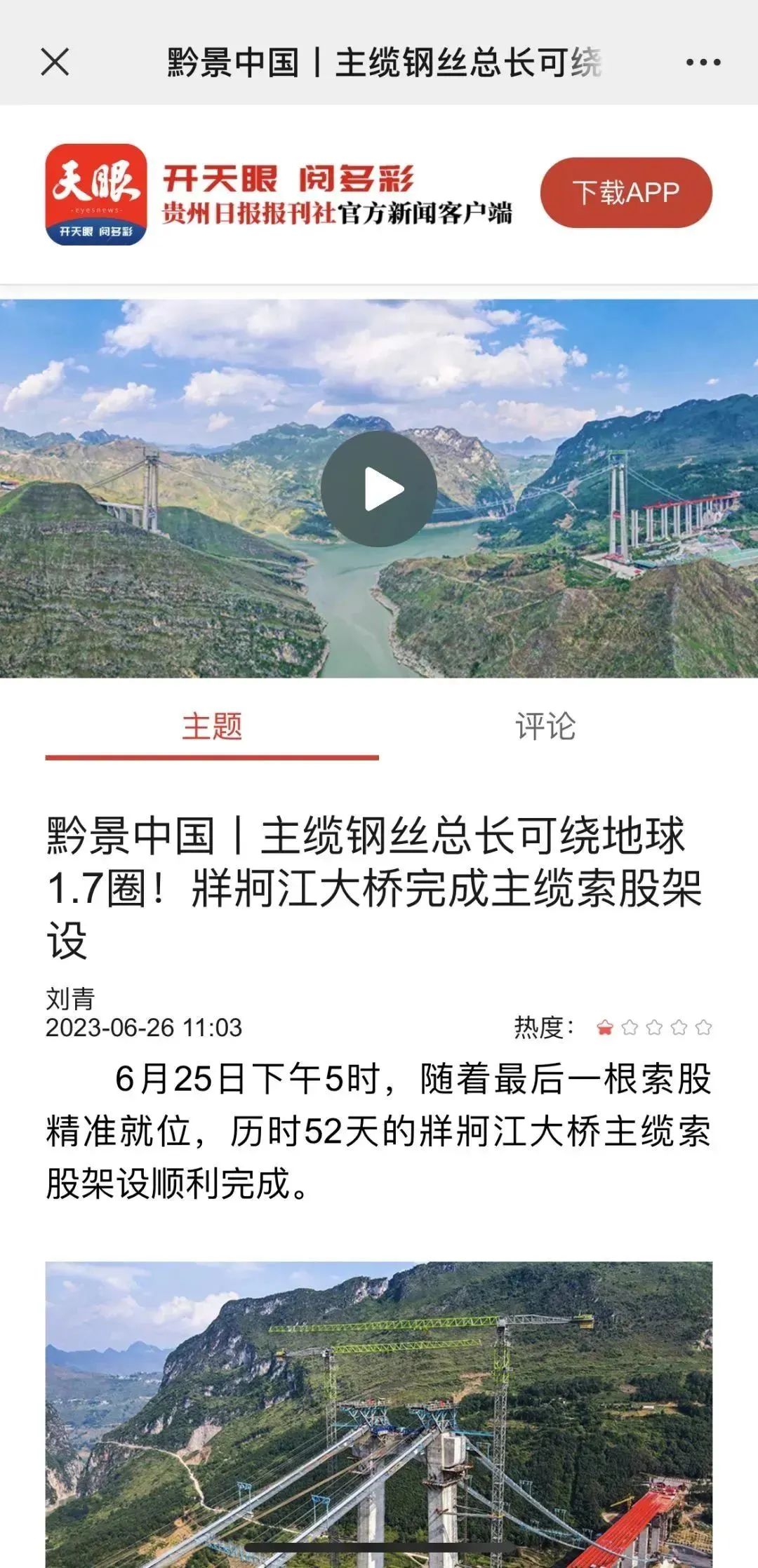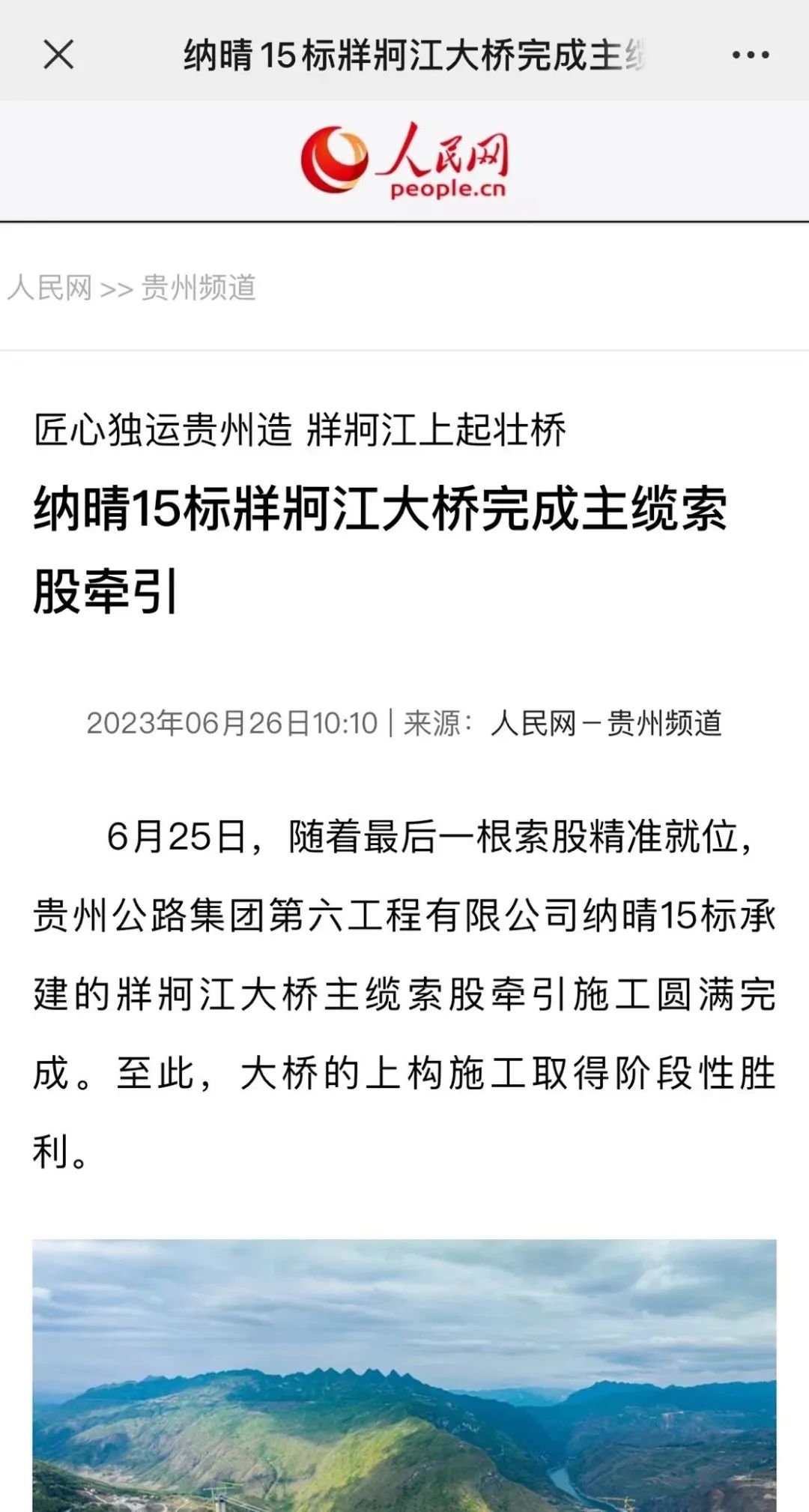 6月25日,新华社、中国交通报、贵州日报天眼新闻、贵州广播电视台、多彩贵州网等主流媒体记者走进由贵州公路集团第六工程有限公司承建的纳晴15标牂牁江大桥施工现场,聚焦牂牁江大桥主缆索股牵引施工,讲述贵州公路人高品质建桥的故事。