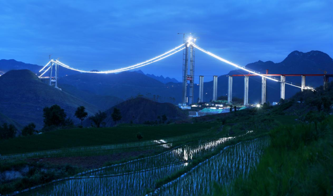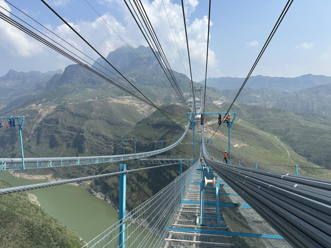 据悉,牂牁江大桥首根主缆索股于5月5日开始牵引,截至6月25日全部索股牵引完成,前后共历时52天,平均每天可完成单幅4根索股的牵引工作。当前,牂牁江大桥整体进度可控,各项工序正按计划顺利推进。主缆牵引完成后,大桥上部结构施工将转入紧缆、索夹吊索安装和钢桁梁吊装阶段,为下一步大桥合龙及实现2024年贯通的目标奠定了坚实基础。