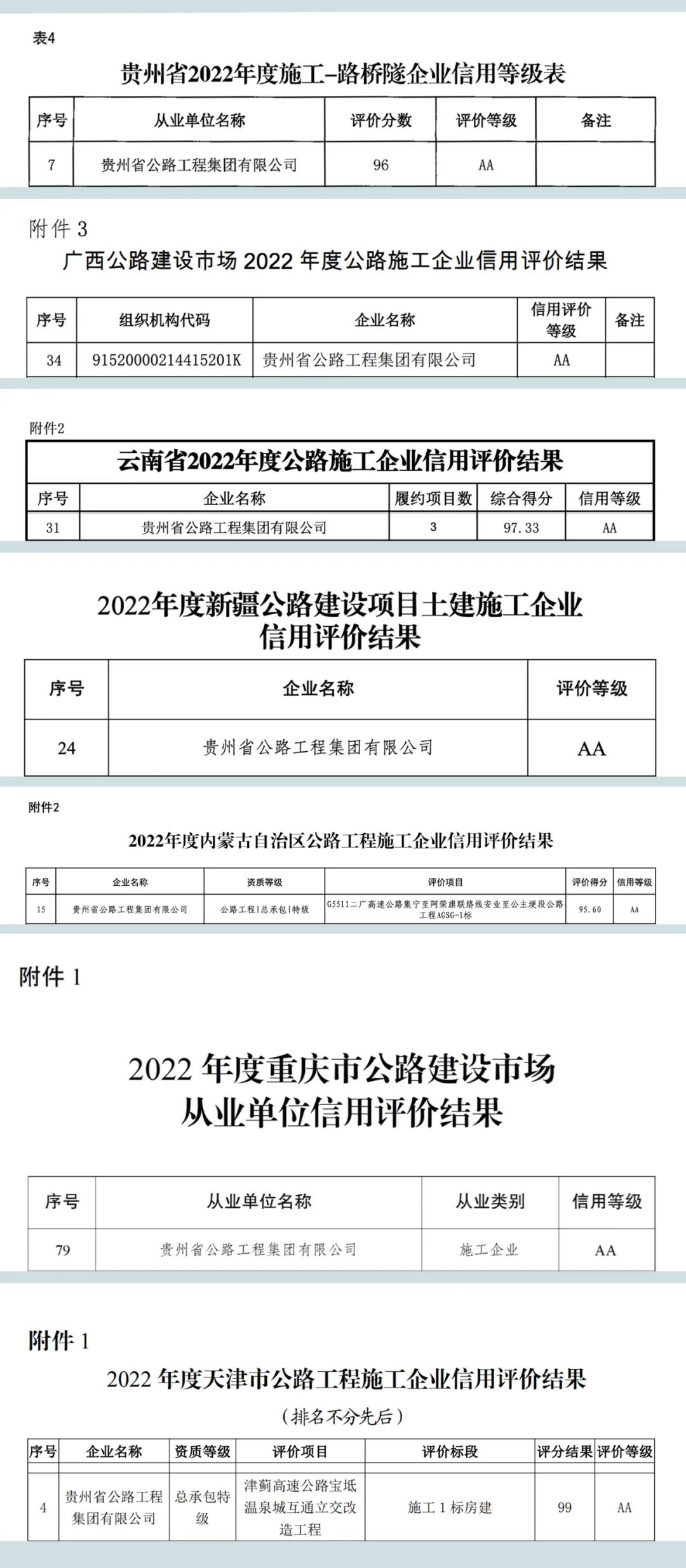 2022年度,贵州公路集团在内蒙古自治区、重庆市、天津市的项目首次参评就斩获了AA等级,并在广西壮族自治区、新疆维吾尔自治区、云南省、贵州省连续5年以上获得AA等级,体现了行业主管部门和市场对贵州公路集团在公路施工领域实力和口碑的认可。