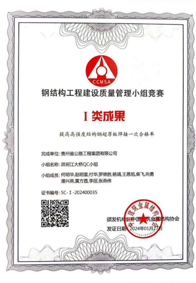 日前,由中国建筑金属结构协会主办的2023年钢结构工程建设质量管理小组竞赛活动优秀成果发布会在北京召开,来自全国各地的220项质量创新和问题解决型项目进行了现场发布和交流。由贵州公路集团纳晴15标牂牁江大桥QC小组申报的《提高高强度结构钢超厚板焊接一次合格率》在成果发表中脱颖而出,获一类成果奖。