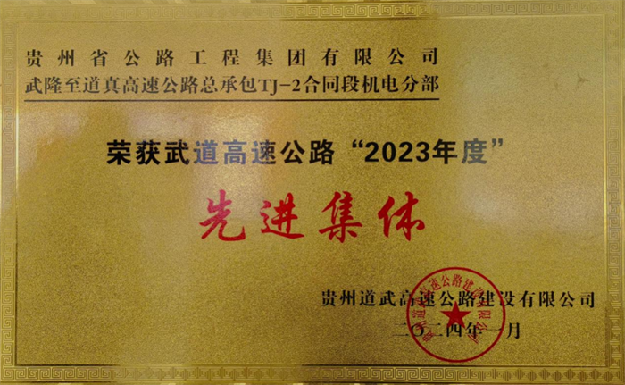 近日,由贵阳电气控制设备有限公司承建的武隆至道真高速公路TJ-2合同段机电工程项目圆满完成2023年工作任务,在贵州道武高速公路建设有限公司年终评比中,荣获2023年度“先进集体”。