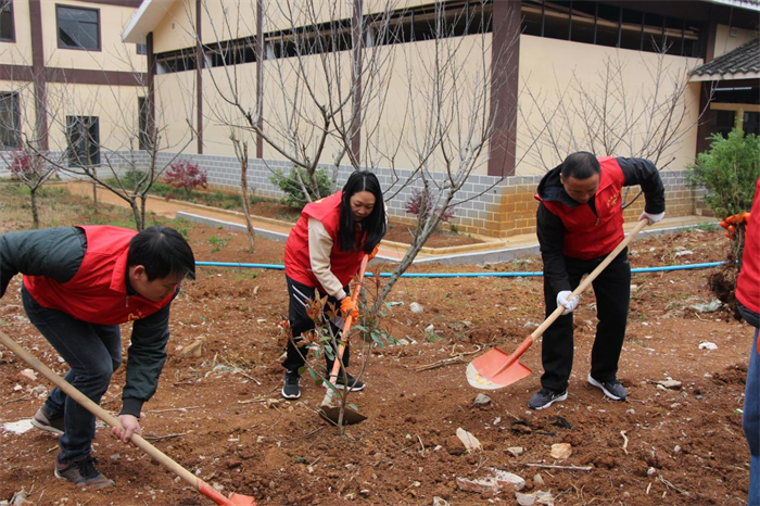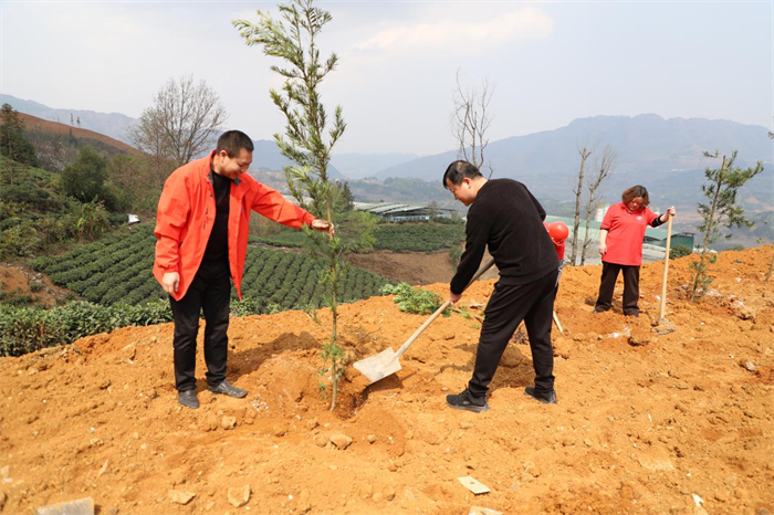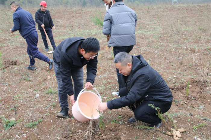 铲土挖坑、扶正树苗、培土围堰、提水浇灌……大家分工协作,默契配合,成功栽种30余棵桃树、杨梅树树苗。这场“春日派对”不仅增强了党员干部职工们的团队意识,更增强了对生态环保的理解与责任感,大家以实际行动践行爱绿、护绿的文明风尚,为生态文明建设贡献绿色力量。