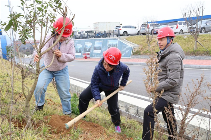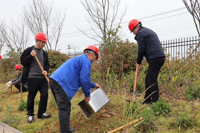 职工们挥锄铲土、放苗扶树、夯土踏实、提水浇灌,分工有序,来回穿梭,认真做好每一道工序,努力提高栽种成活率。在大家的紧密配合下,一棵棵新栽种的小树苗迎风而立、生机盎然,为春色增添了盎然生机。此次植树活动各项目累计种植桂花、冬青、槐树、红叶石楠、松树等400余株树苗。