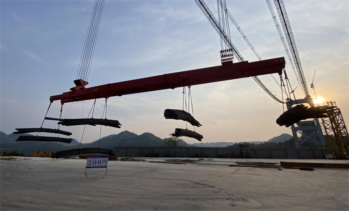 据悉,金州大桥作为贵州省跨径最大的市政悬索桥,主桥为单跨450米的钢桁架加劲梁,由42个标准节段与2个非标准节段钢桁梁组成,钢梁总重9120吨,采用缆索吊装工艺安装作业。为保障后期钢桁梁吊装施工的有序推进,金州大桥建设团队当日按照缆索吊装系统额定荷载重量的80%、100%、110%、125%逐级开展试吊试验,以验证该系统的起吊能力以及安全性。