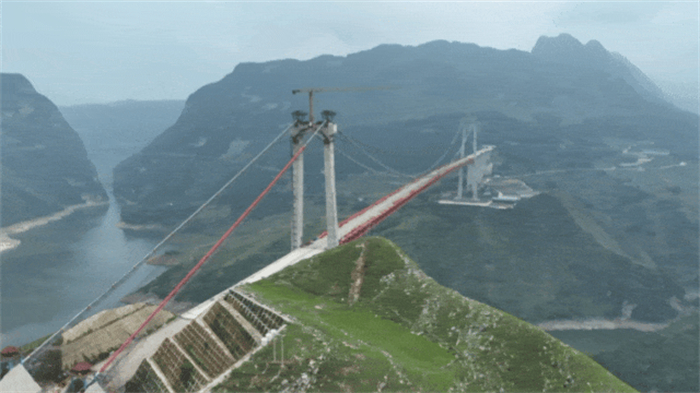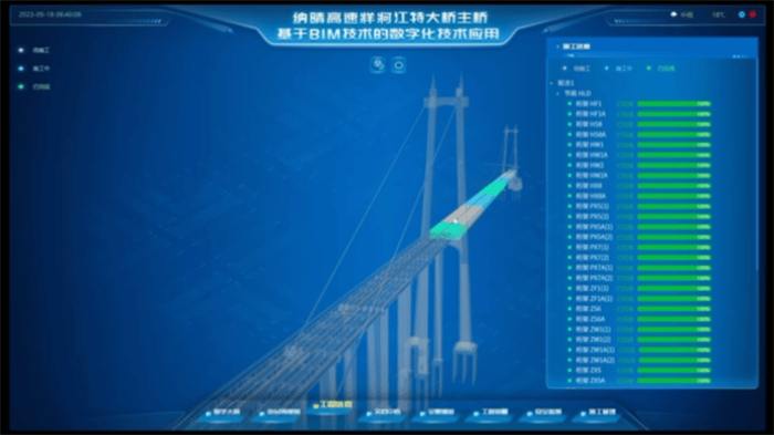 由贵州公路集团第六工程有限公司承建的纳晴15标牂牁江大桥全长1849米,主跨1080米,是一座双塔单跨钢桁梁悬索桥。建设过程中,项目团队紧紧围绕智慧工地建设目标,采用先进的在线BIM技术与工程动静态数据结合,以BIM技术的可视化、参数化、可模拟、可协调特性,结合云计算、大数据、物联网、AI等技术,实现工程项目从设计到后期维护的全套数字化管理和模拟优化。