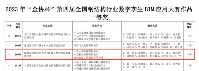 近日,2023年“金协杯”第四届全国钢结构行业数字孪生BIM应用大赛评审结果公布,贵州公路集团申报的“纳晴高速牂牁江大桥BIM数字化智能建造技术应用”作品从207项参赛作品中脱颖而出,荣获一等奖。