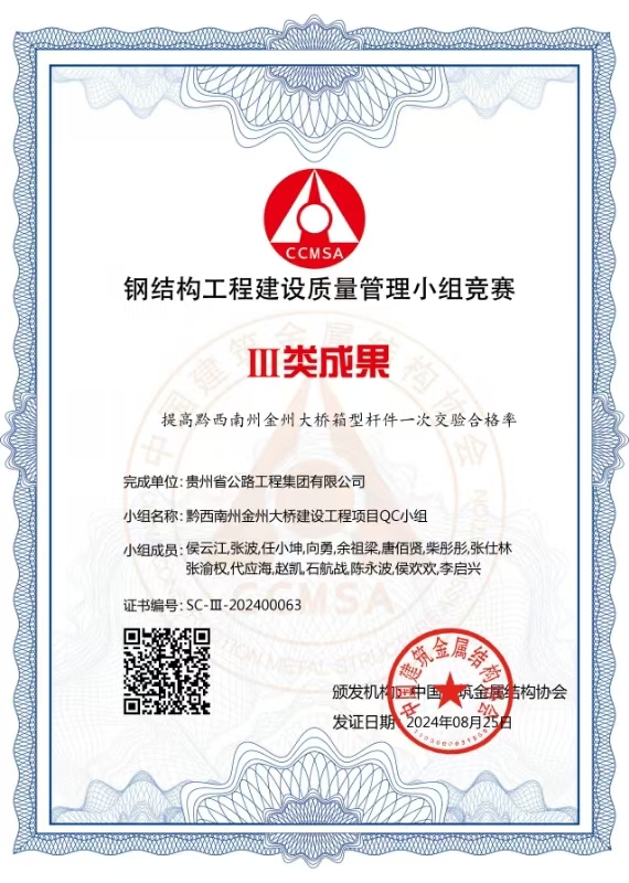日前,中国建筑金属结构协会公布了2024年全国钢结构工程建设质量管理小组竞赛活动优秀成果获奖名单,由贵州公路集团第六工程公司金州大桥QC小组申报的“提高黔西南州金州大桥箱型杆件一次交验合格率”课题荣获III类成果奖。