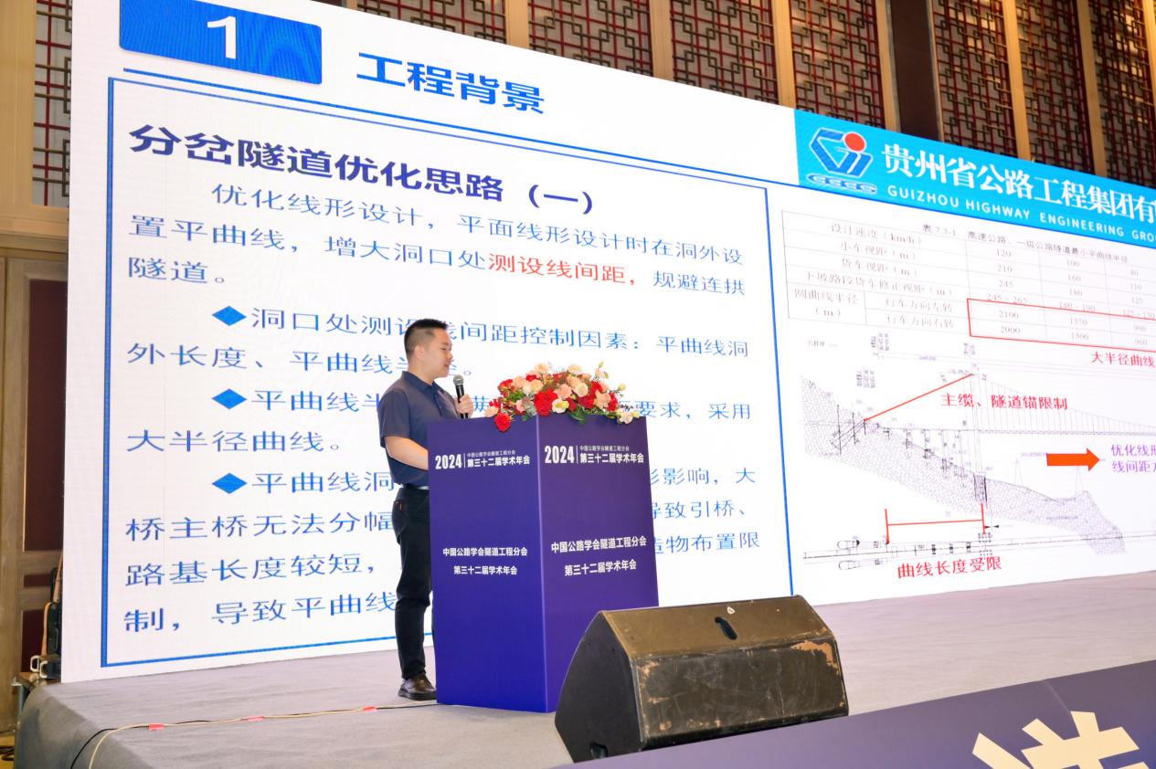 贵州公路集团总工办副主任龙立敦分享了题为“贵州山区桥隧相接工程分岔隧道近接施工技术研究及实践”的报告,从贵州山区深切峡谷桥隧相接工程分岔隧道建设过程中面临的技术难题出发,结合近几年来公司建设的具体工程案例,介绍了无中导分层式直墙连拱隧道、近零净距隧道、极小净距隧道等贵州公路集团在工程实践研究中形成的全新隧道结构设计形式和施工方法。