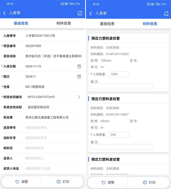 第一步:库管员手机扫描获取实物明细,并输入供应商信息,然后在“工程数字化管理平台”生成入库单。