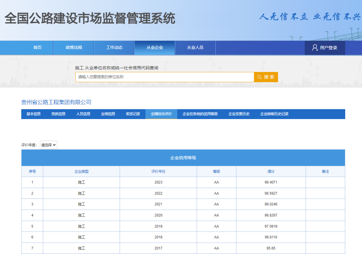 近日,交通运输部公布了2023年度公路建设市场全国综合信用评价结果,贵州公路集团再次荣获公路施工企业全国综合信用评价AA等级。从2017年到2023年,贵州公路集团已连续七年获得公路施工企业全国综合信用评价AA等级。贵州公路集团所属贵州黔贵路桥工程有限公司连续三年获评AA等级,所属贵阳电气控制设备有限公司也连续四年获评AA等级。