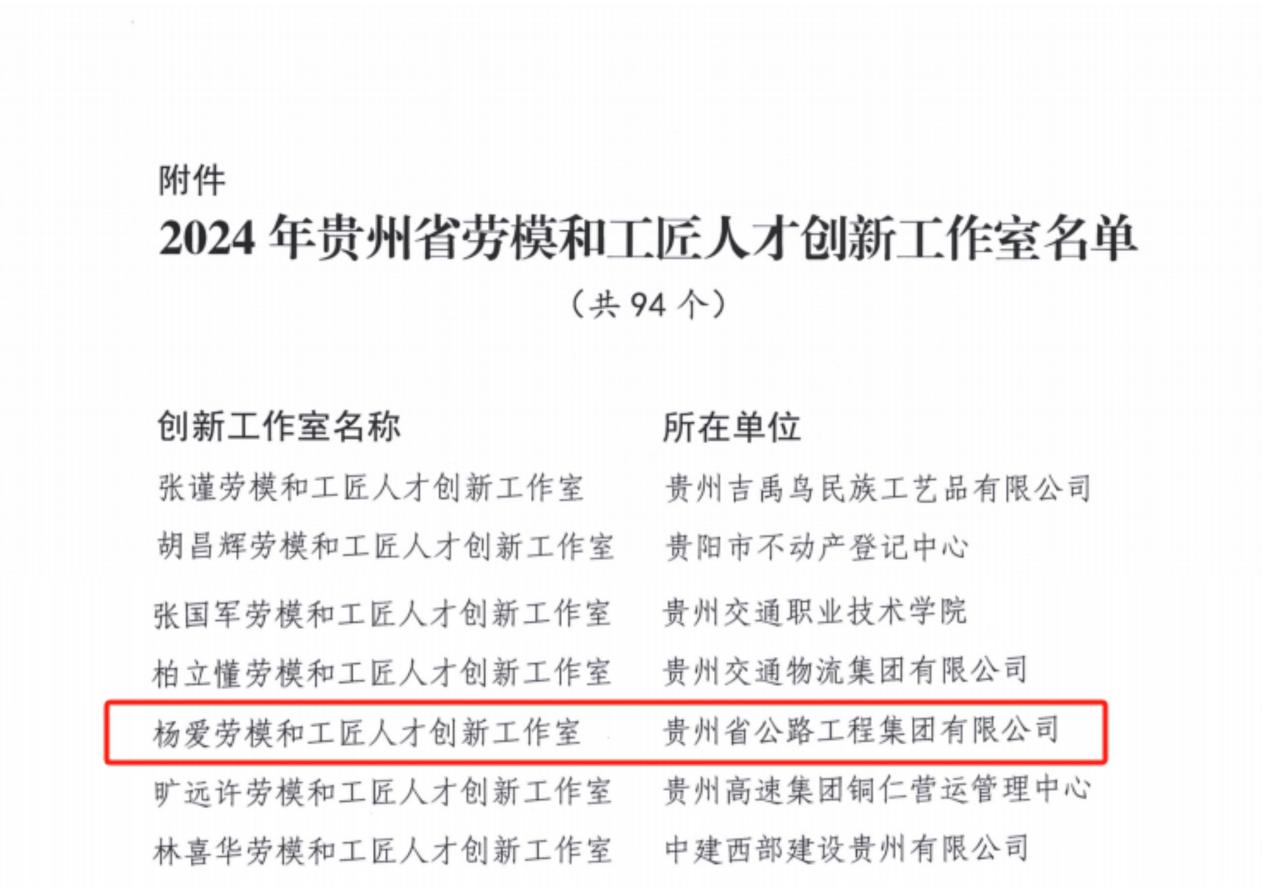 近日,贵州省总工会公布了“2024年贵州省劳模和工匠人才创新工作室名单”,贵州公路集团第八工程有限公司“杨爱劳模和工匠人才创新工作室”获得“贵州省劳模和工匠人才创新工作室”命名。