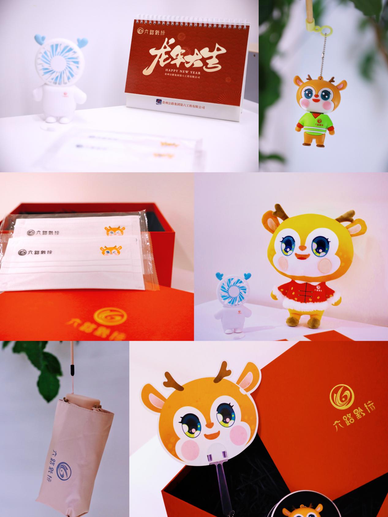 “六路黔行”文创产品:以贵州公路集团第六工程有限公司logo、吉祥物“路小鹿”IP形象等品牌标识为依托设计衍生而来,巧妙融入了黔山秀水、道路桥隧、数字等元素,设计制作了一批具备创意性、趣味性和实用性的文创“周边”,包括公仔、台历、U盘、口罩、摇扇、便携风扇、晴雨伞、糕点模具、礼袋、礼盒等可视化实物。