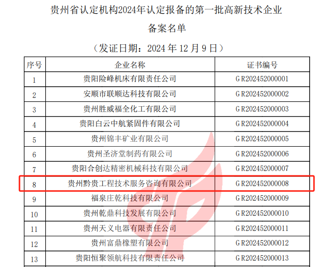 日前,全国高新技术企业认定管理工作领导小组办公室公布了“对贵州省认定机构2024年认定报备的第一批260家高新技术企业备案名单”,贵州黔贵工程技术服务咨询有限公司顺利通过认定,升级为“国家级”高新技术企业。