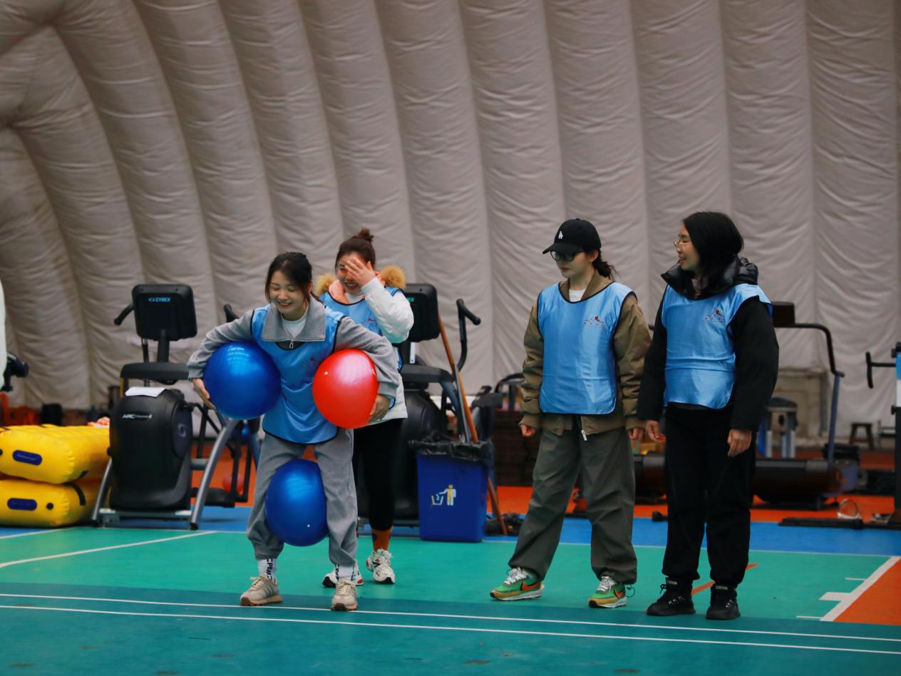 学法环节刚结束,现场秒变“大型团建现场”。“企鹅漫步”赛道上,大家抱着瑜伽球摇摇晃晃,像极了QQ表情包;“四人五足”环节,虽然喊着“一二一”却集体顺拐;“同舟共济”环节,大家挥洒汗水、团结协作,展现出巾帼不让须眉的飒爽英姿。