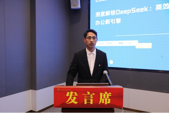 贵控公司团支部书记祁道景以《深度解锁DeepSeek:高效办公新引擎》为主题,详细介绍了DeepSeek这款AI大模型的功能和使用方法,并现场演示了如何运用该软件进行高效办公。