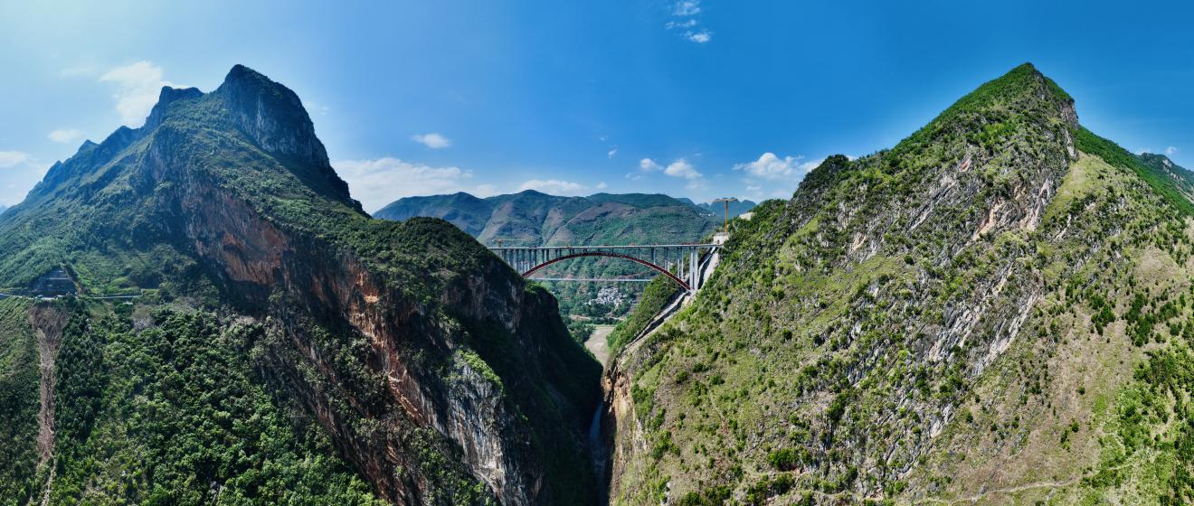 乌蒙山大桥位于六盘水市六枝特区中寨乡,横跨阿志河峡谷,是纳晴高速重点控制性工程,主拱圈跨径270米,左幅全长491.5米,右幅全长511.5米,设计速度100公里/小时,采用双向六车道标准建设,建成后将成为世界首座钢桁腹杆-混凝土组合拱桥。