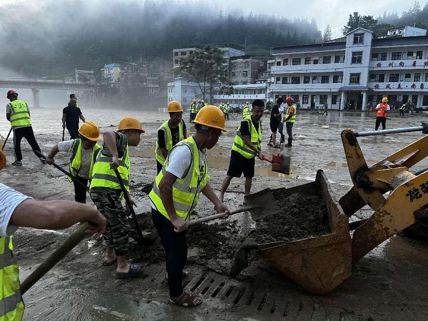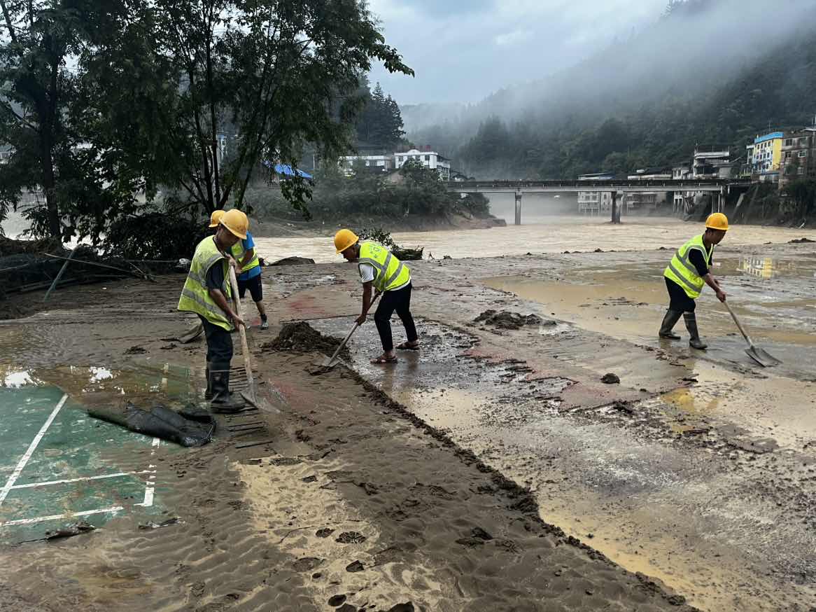 6月28日傍晚,三都水位下降至安全水位后,项目部立即组织设备和人员对G321改扩建工程沿线新增的7处塌方路段进行疏通、清理。同时,项目部还调集洒水车、装载机以及扫帚方铲等设备设施,以及30余名工作人员和劳务工人,协助民兵、武警队伍等救援力量,对附近的打鱼民族学校的进行操场汛后清淤清扫。截至29日上午9时,已全部清理完毕。