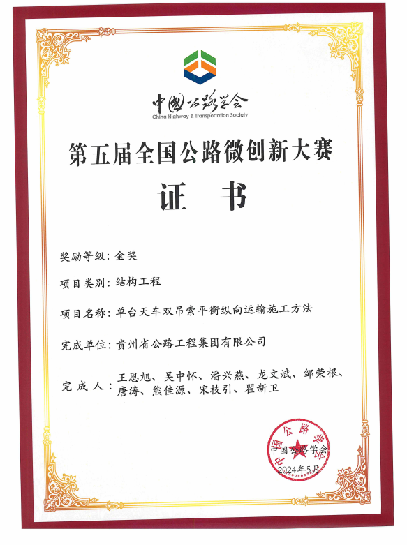近日,由贵州公路集团第六工程公司纳晴15标创新研发的“单台天车双吊索平衡纵向运输施工方法”,在第五届全国公路微创新大赛中斩获金奖。该技术通过设备革新与工艺优化,轻松实现了悬索桥吊索安装的“快、准、省”,为同类工程提供了施工新范式。