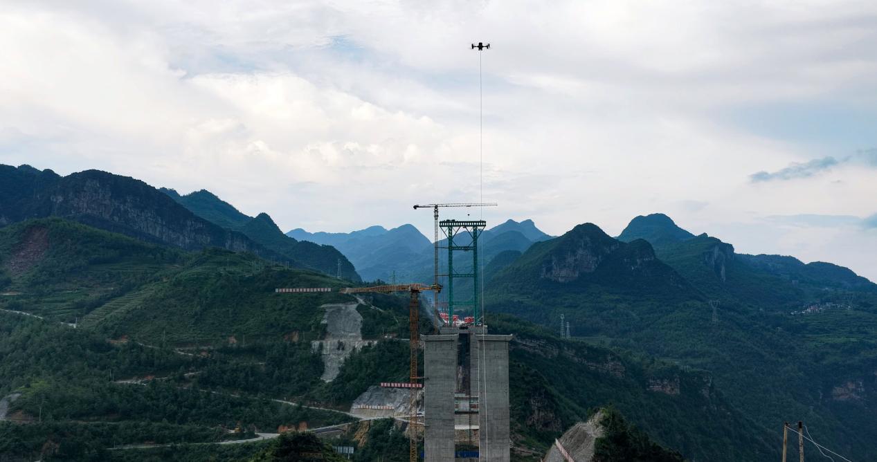 这架无人机从六车河特大桥的10号拱座起飞,身后拽着一根500米长、直径4毫米、重5公斤的“红线”——先导索,短短10分钟,稳稳地飞越峡谷,降落在11号拱座,成功把两岸拱座“牵上了手”。