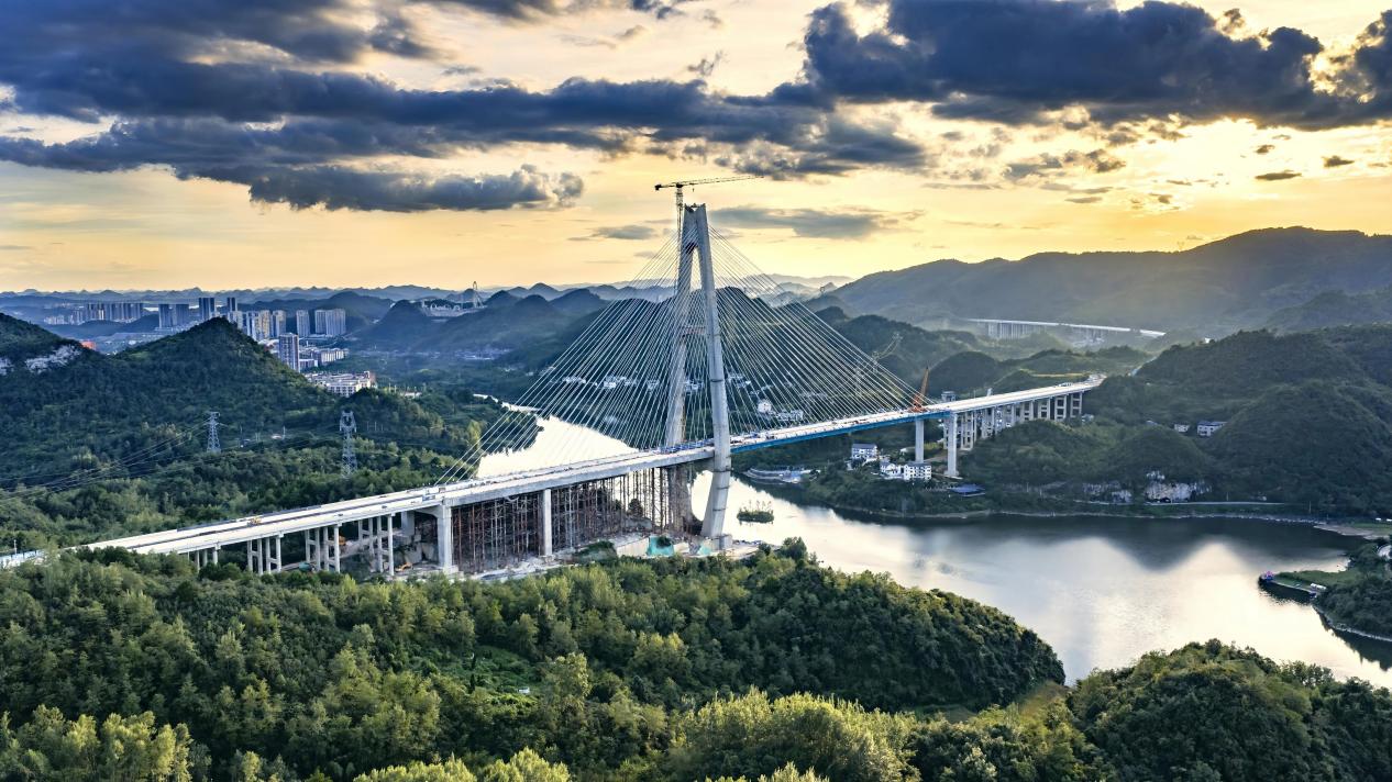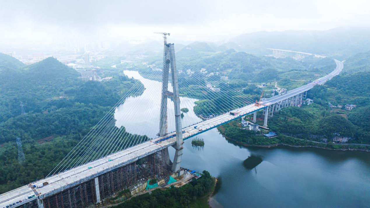 百花湖大桥是贵州省内同类型最大规模混合梁单塔斜拉桥,大桥全长1086米,主塔高219米。项目位于贵州省清镇市与观山湖区交界处,横跨百花湖二级水源保护区,主塔毗邻百花湖,环水保要求极高。自2023年3月桩基施工启动以来,项目团队高度重视生态环境保护,采用闭环管理模式,通过三级沉淀池、浆液分离系统等技术实现施工污水零排放,未发生任何水源污染事件。针对富水岩溶桩基、超高混凝土主塔建设等技术难题,项目团队研发应用了空压反循环清孔净化装置、大体积混凝土智能温控系统等关键技术,创新塔梁同步施工、纵移式桥面吊机钢混结合段施工等工艺,高质量完成桥梁主体工程建设。