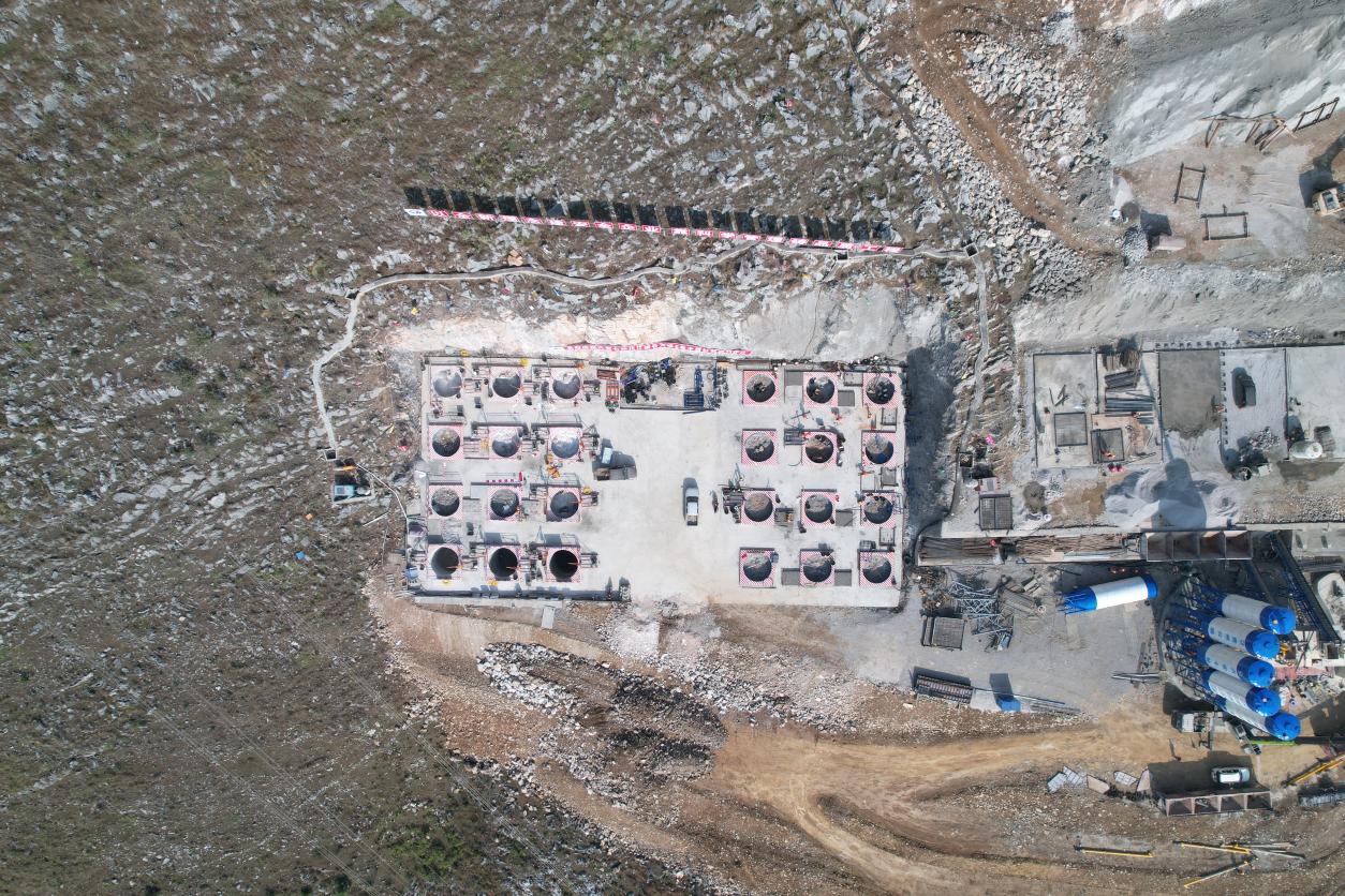 大桥六枝岸主塔地处陡峭斜坡,自然坡度30°-45°,地形复杂,岩溶发育,施工区域严重缺水,传统机械钻孔易卡钻。项目团队创新采用“人工挖孔+传统干桩+导管浇筑”施工工艺,利用“人工+机械”进行干法挖孔,避免了传统湿法钻孔中需要大量水循环冷却和环境污染的问题;挖孔完成后,通过导管进行混凝土浇筑,确保桩基的质量。“人工挖孔+传统干桩+导管浇筑”施工工艺不仅有效解决了场地受限、缺水、环境保护等难题,还提高了施工效率,保证了桩基的施工质量。