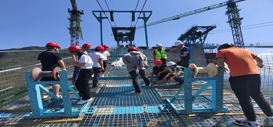 1、在施工过程中,为确保牂牁江特大桥猫道的顺利架设,项目部制定了详细科学的专项施工方案,多次召开交底会,对大桥上部施工方案、施工图纸和施工工序进行严密交底,抓质量、保安全、抢进度、提效率,为圆满完成猫道架设任务打下了坚实基础。