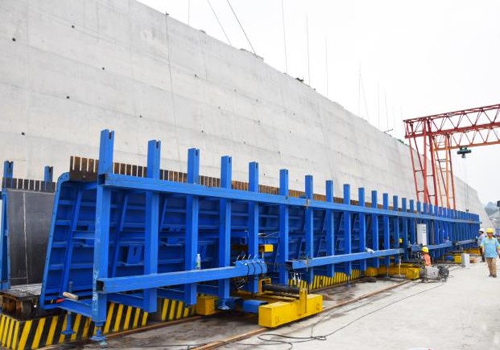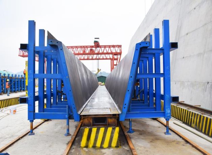 箱梁液压模板施工;一体式液压模板由模板、轨道、液压控制系统、行走系统和连接件组成,解决了跨度大、横隔板多、负弯矩多等多项脱模难度大的难题。液压箱梁取代了传统人工装模、拆模、吊装转运模板的传统工艺,液压箱梁模板只需首次人工安装模板,后期的装模、拆模全部采用液压控制系统整体装拆实现,拆完模后启动电机把模板直接开到下一工作台座位置即可,整个过程大大减少了人工,减少了吊装,节省了装模拆模的时间。