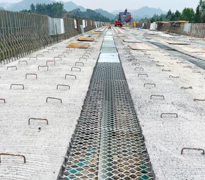 在桥梁桥面系及附属工程施工中,主要采用了伸缩缝预留后浇工艺、桥梁防撞护栏钢筋整体式预埋工艺、湿接缝防坠网安全防护等。