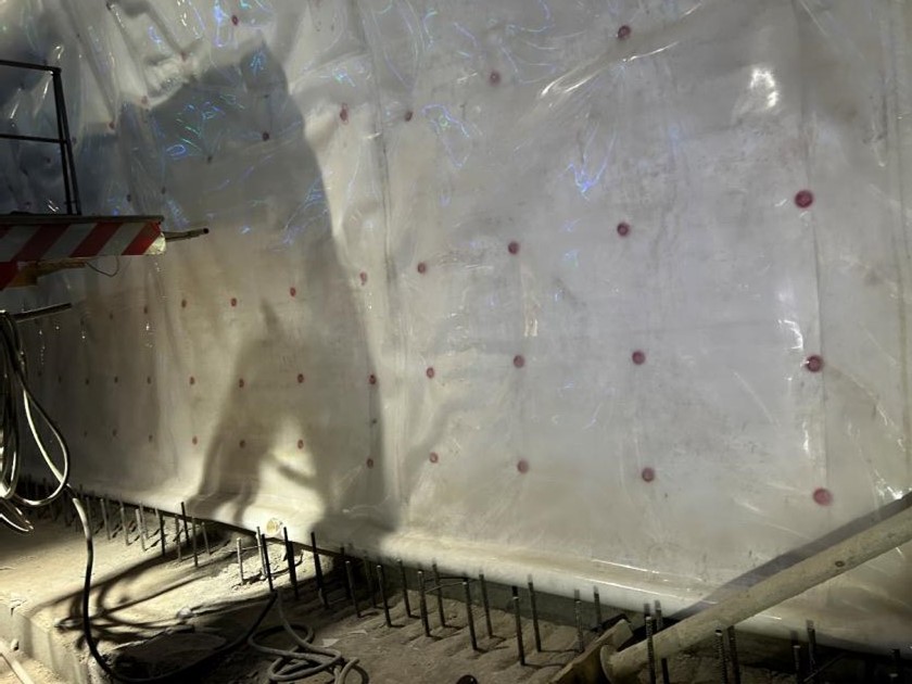 防水板施工前要做好断面检查,凿除侵限部分,并对初期支护表面局部的凹凸部分进行处理。二衬有钢筋地段,焊接钢筋时在防水板周围用薄钢板等不燃材料进行遮挡,以免焊接时飞溅的火花灼坏防水板。防水板铺挂时应留出足够的空余量。由一人在焊机前方约50cm处将两端防水板扶正,另一人手握焊机,以试调好的恒定速度向前走,中途不能停顿,整条焊缝的焊接要一气呵成。